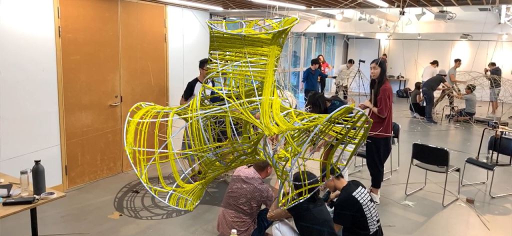 ARgan was built at CUHK in the fall of 2019 in collaboration with Fologram and 30 participants of a design-and-build workshop on the integration of AR in construction. The sculpture’s design consists of a large, geometrically complex shape purposefully created to be most challenging to build with only traditional means and methods. The devised construction workflow responded to this challenge by including holographic setups to interactively guide the manufacturing process. These setups were created on multiple devices, such as a series of Microsoft HoloLenses and several handheld Smartphones, all linked simultaneously to a single digital base model.