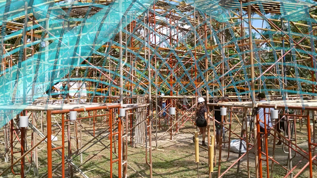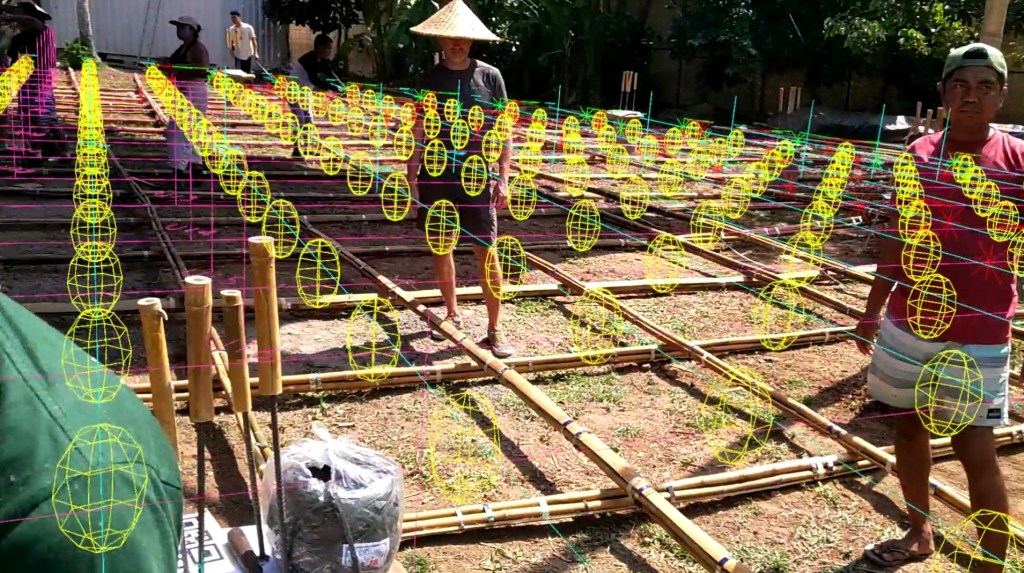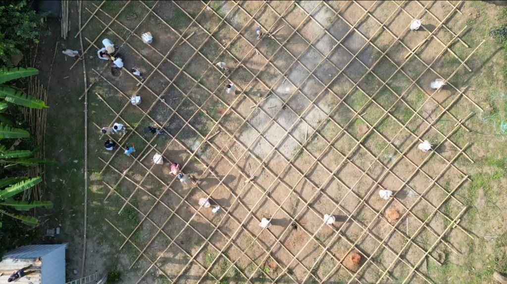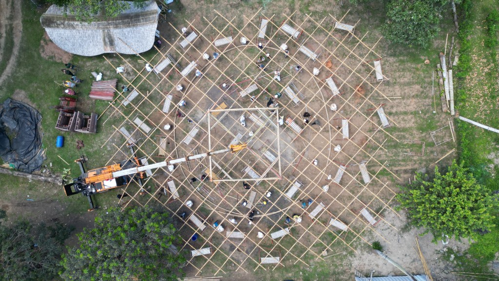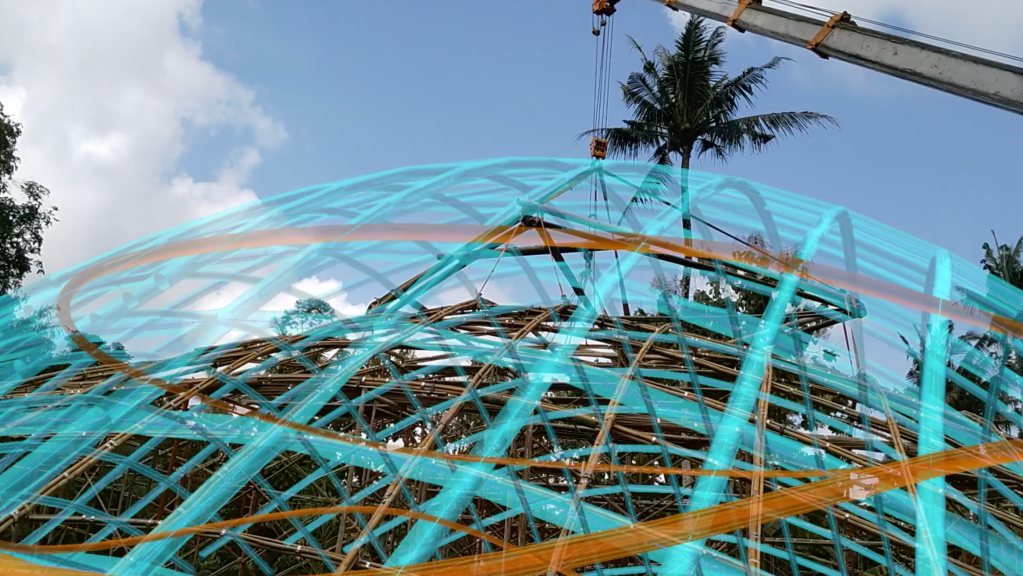 The structure was first assembled as a shear-flexible, equidistant grid on the ground, lifted by crane, and allowed to undergo controlled bending and self-organization under gravity into its final doubly curved form before being locked into place by diagonals and perimeter supports. The bamboo grid, composed of bundled and hand-tied culms and splits, was erected in just 10 days, with subsequent refinements by local craftsmen. Its deformation behavior was simulated in Kangaroo 2 (Rhino Grasshopper) to ensure geometric viability. AR technology assisted onsite assembly, integrating digital workflows into natural material construction. The project’s use of computational design and AR technology facilitated the precise and efficient assembly of the bamboo gridshell, allowing non-experts to engage in the construction process. This approach not only democratizes building practices but also addresses the challenge of conveying complex construction information to diverse teams, thereby enhancing collaboration and decision-making. The integration of computational design and AR as a tool for real-time visualization and error detection underscores its utility in bridging the gap between digital design and physical construction, marking a step forward in finding alternatives to traditional construction documentation methods.